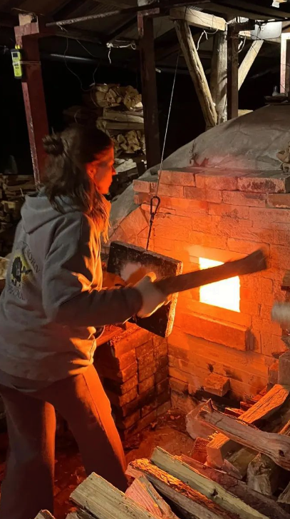 Firing a Japanese style wood burning kiln ("Anagama" or "Noborigama") is a labor of love requiring a team of dedicated, hard working people. The kilns are usually very large and hold thousands of pieces that are fired round the clock for days on end. Participants prepare by chopping and stacking cords of wood, carefully loading the kiln, and then taking turns stoking the kiln round the clock for anywhere between three days and a week, depending on the design of the kiln. The pieces are left unglazed and during the firing the ash flying about inside the kiln, circles and lands on them, solidifying into a natural glaze once the kiln is cooling. Temperatures of at least 1285 degrees celsius (2345 farenheit) are reached, and the kilns require days to cool down until they can be opened. The results are one of a kind pieces that that tell the story of the path of the fire and ash over time. Wood fired pieces are a testament to this ancient firing process, which is nothing short of magical.