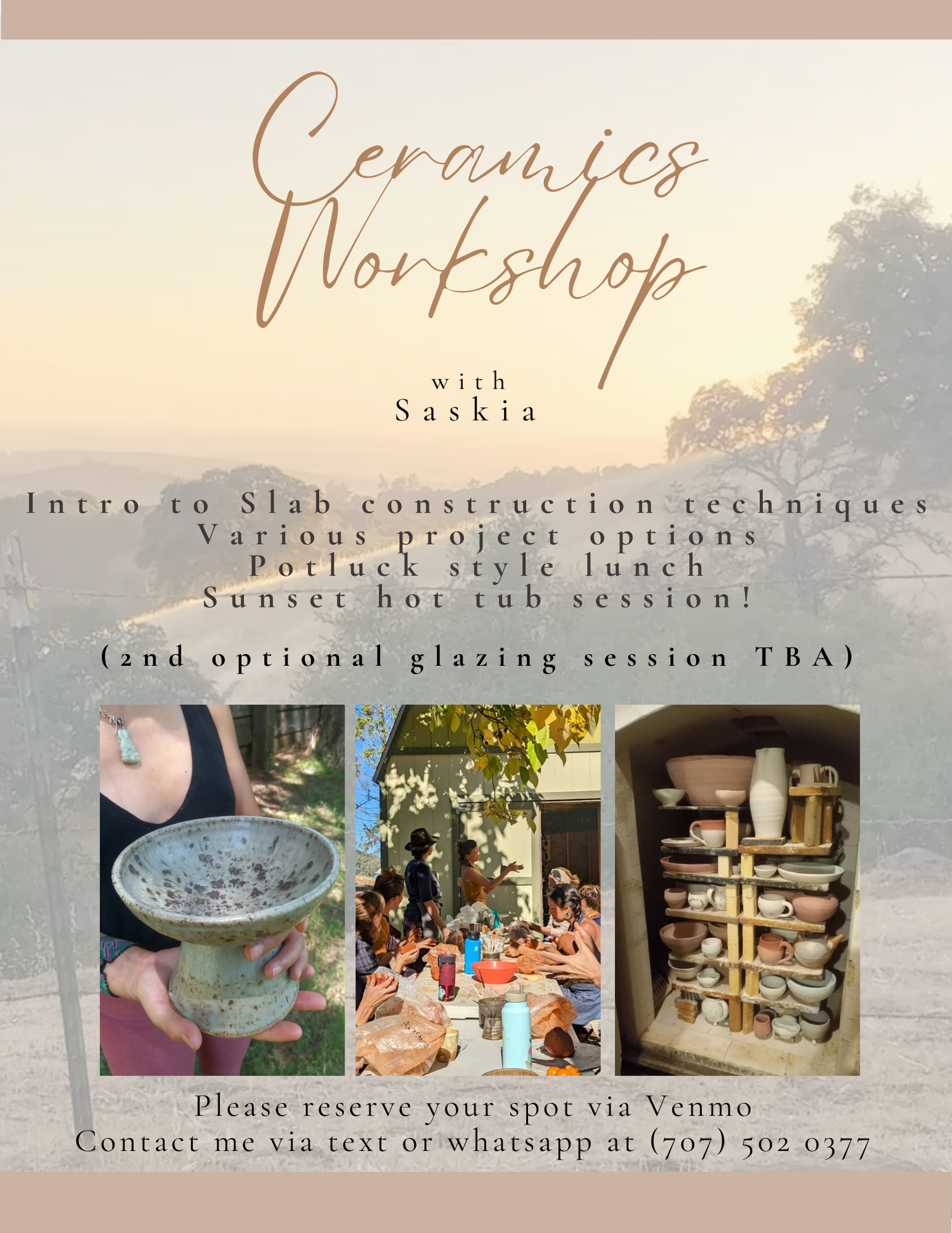 Next workshop: All day workshop (limit 10 students) at my home studio in Grass Valley. Introduction to ceramics, focusing on the 3 main methods for hand building. Date TBD--weekend in mId or late November with 2nd glaze workshop 2 weeks after.